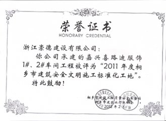 王庭世家2016年度標準化工地榮譽證書